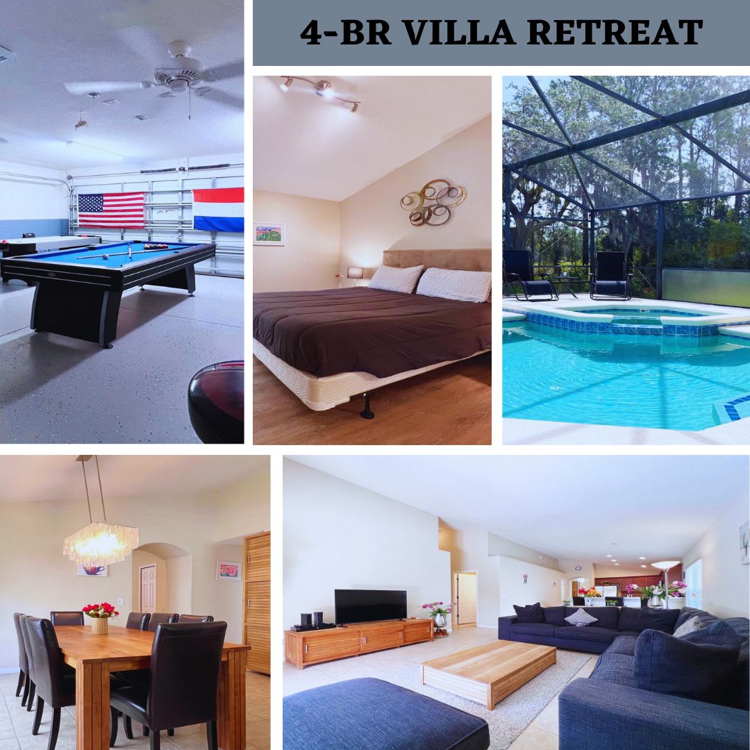 FS384472- Watersong - 4 Bed 3 Baths Villa:During your stay, you will enjoy this well-appointed home that has been designed and decorated to provide you and your family an abundance of luxury amenities and leaves you well equipped to vacation with all the usual items you would expect to find at home.This spacious 4 bedroom holiday villa can comfortably accommodate a larger family or group of up to 8 people. Home Features- 4 Bedrooms 3 Baths Fully Equipped Kitchen Private Screened Pool and Spa With Lanai Spa-this not a hot tub, spa is only heated to the same temperature as the pool if pool heat is added Patio with Outdoor Furniture and Spacious Deck Game Room with Pool Table, Foosball, and Air Hockey Full-Size Washer/Dryer Dishwasher Central Air Towels and Bed Linens Wireless Internet 50" Flat Screen TV in Living Room TVs in 2 Bedrooms and Upstairs Great Room 2180 Square Feet Pool Direction NortheastSleeping Arrangements:1-King 1-Queen 1-Full 2-TwinsMain Features:* 4 bedroom / 3 bathroom – Sleeps up to 10* 2180 sqft villa* Private Pool with child safe fence* Hot Tub for relaxation after a long day* Free Wifi, Free long distance calling to anywhere in the US, Canada, and Mexico* Fully equipped kitchen, washer and dryer, towels and linens are all included* Your own private living space with HDTV* Games room to entertain everyone from all agesNote: Pool/Spa heating is optional. Grill and Baby Gears are available for rent upon request.Watersong:Watersong is a beautiful Vacation Resort located just 9 miles to Walt Disney World and 18 miles to Universal Studios of Orlando. This feature packed Gated Community Vacation Resort offers many amenities that will help make your dream Orlando vacation come true! Some popular amenities include the Swimming Pool, Water Slide, Spa, Steam Room, and Fitness Center. Watersong is located about 30 minutes away from the Orlando International Airport, and 20 minutes away from the Amtrak station. Looking for food? There is a long list of restaurants located just nearby, some of which includes Olive Garden, Charlie's Steakhouse, Outback Steakhouse, Bonefish Grill, and Bahama Breeze. Food delivery services such as Uber Eats are also readily available. If you are looking for more than just the theme parks, there are also other activities such as shopping, hiking, fishing, horseback riding, and water sports. Sweet Home Vacation:We are a professional Vacation Home Rental Agency with over 12 years of experience In the Orlando, Florida area. Your safety and comfort Is our top priority, and all of our homes are cleaned with enhanced safety and cleaning methods. No check-In is required as you may go directly to the home with the provided access code. If you have any questions, our reservation team at Sweet Home Vacation is available to help you 7 days a week. We can also help you locate car rentals and tickets for Orlando's famous attractions. Whether this is your first time, or you are a returning guest, we will make sure you have an amazing trip. Book now or send us your inquiry. We are looking forward to accommodating you!